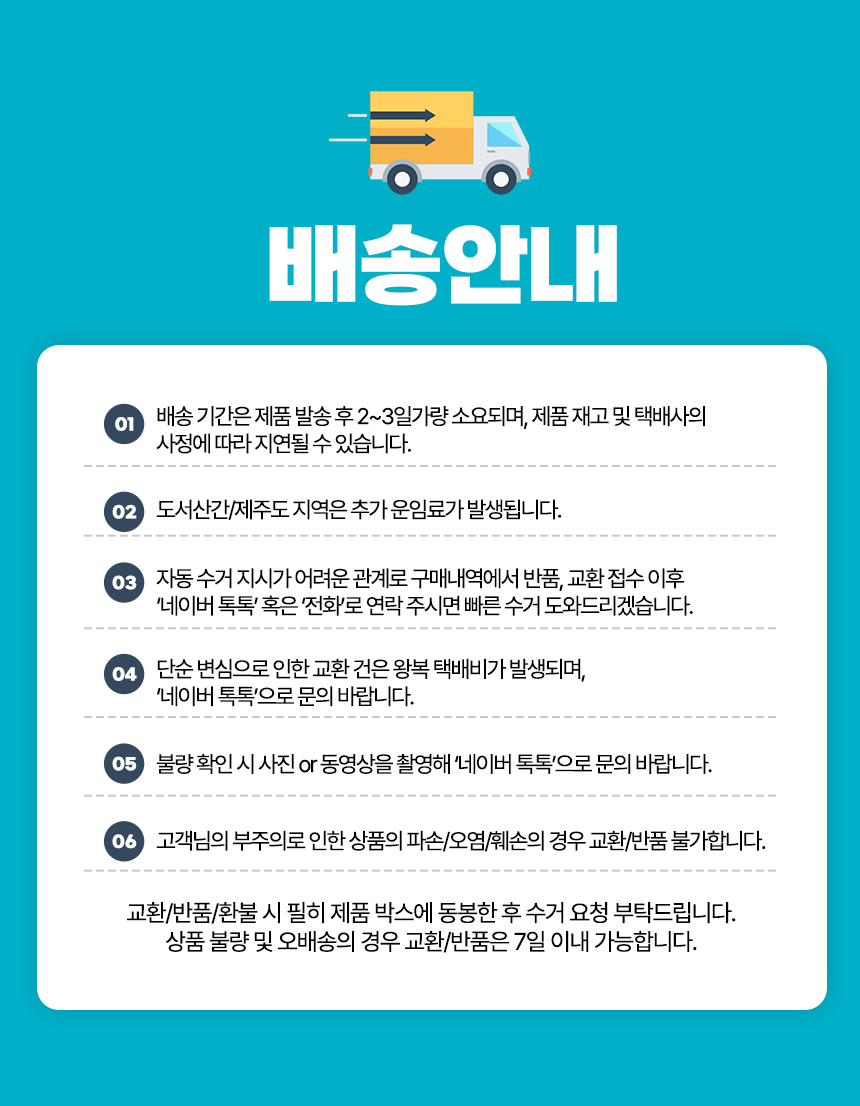 • - 배송안내: 전국 배송이 가능하며, 토요일과 공휴일을 제외하고 평균 2~5일 소요됩니다.
